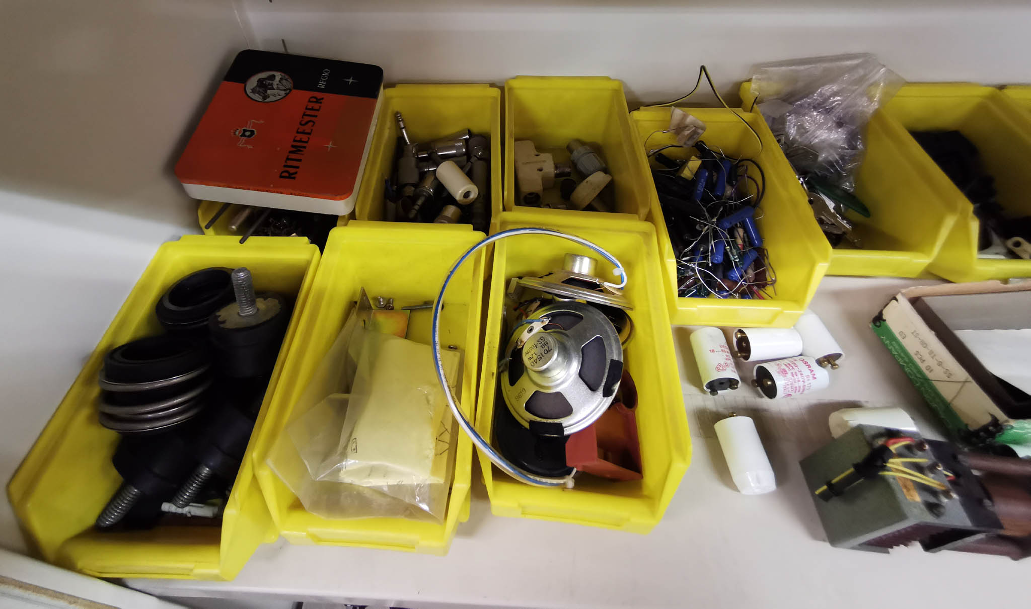 Verwijderd Elektronische en elektrische componenten en materialen(oude) meetapparaten en onderdelen van bij de vroegere werkgever, vintage materiaal bestemd om weg te geven (gooien) vanwege verhuis.De foto’s geven een idee van de inhoud van de kasten. Mocht er iets tussen zitten wat je interesseert, je weet nooit, laat dat dan maar weten. Het was de bedoeling om door de foto’s een idee te geven of het voor je de moeite zou zijn om ter plaatse te komen kijken of er iets tussen zit waar je iets mee kan doen. Maar door die Covid-19 toestanden kan dat niet meer. Mocht je toch iets herkennen wat je wil hebben geef me dan een mailbericht en als ik daar zelf nog eens langs ga dan kan ik het meebrengen. Als dat ding er dan nog is natuurlijk. Tegenwoordig houden ze daar zelf elke woensdagmiddag een opruim ronde en zien ze wat ze op die tijd in de containers weggegooid krijgen. Er staat wel heel veel, buiten de foto’s staat er nog vele malen meer mechanisch materiaal, ze zijn dus nog wel even bezig. |